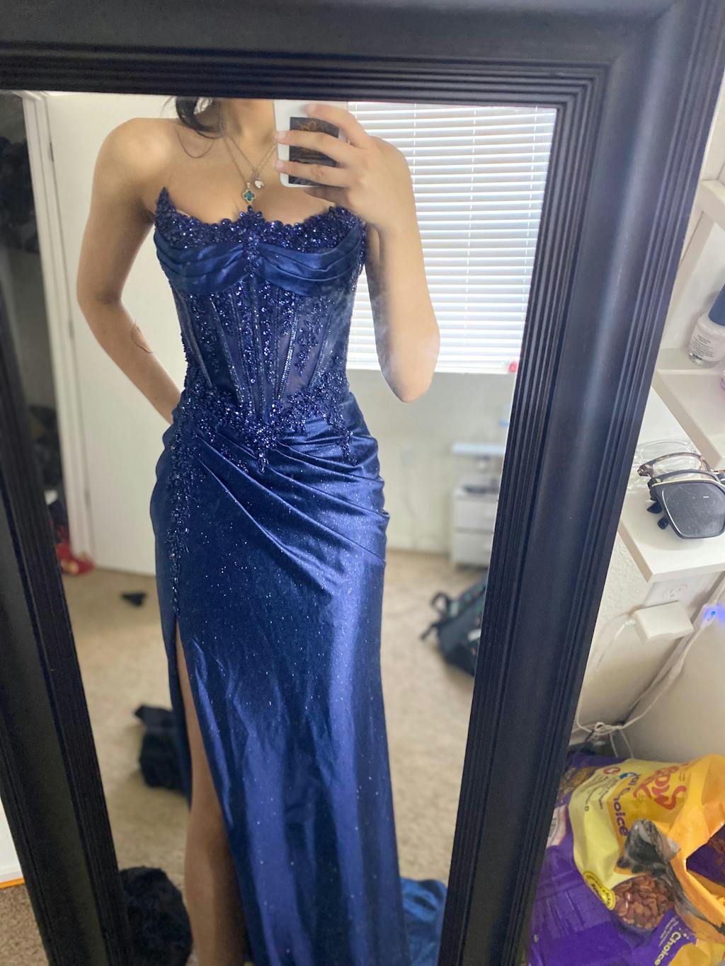 - Design: Strapless sweetheart neckline, sheer beaded corset bodice & high slit
