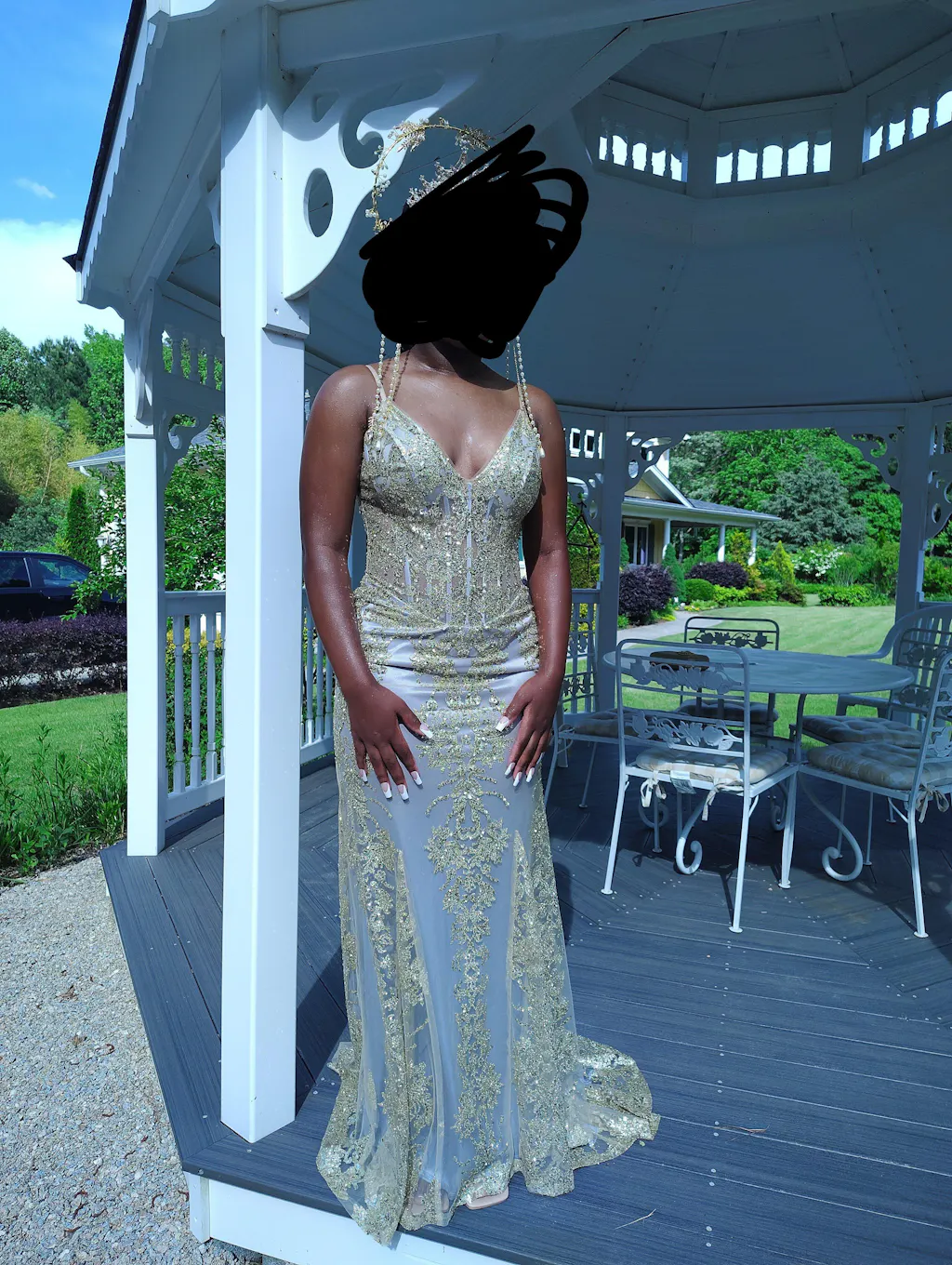 Designed for your next Gala event or special occasion, this mermaid gown is an empowering fit with a metallic embroidered lace composition artfully appliquéd with sequin accents. The gown features a flattering basque waistline, v-neckline suspended from delicate spaghetti straps, and a sheer bustier bodice adding a flair of sensuality.